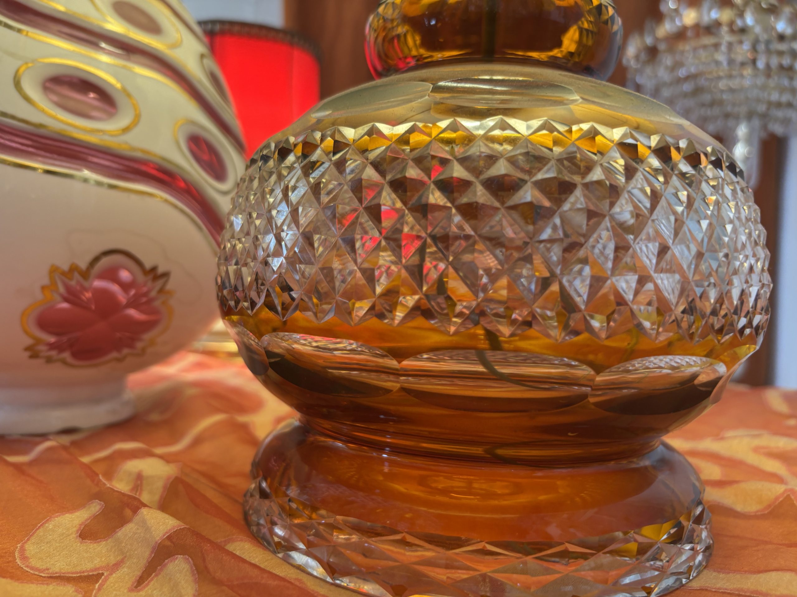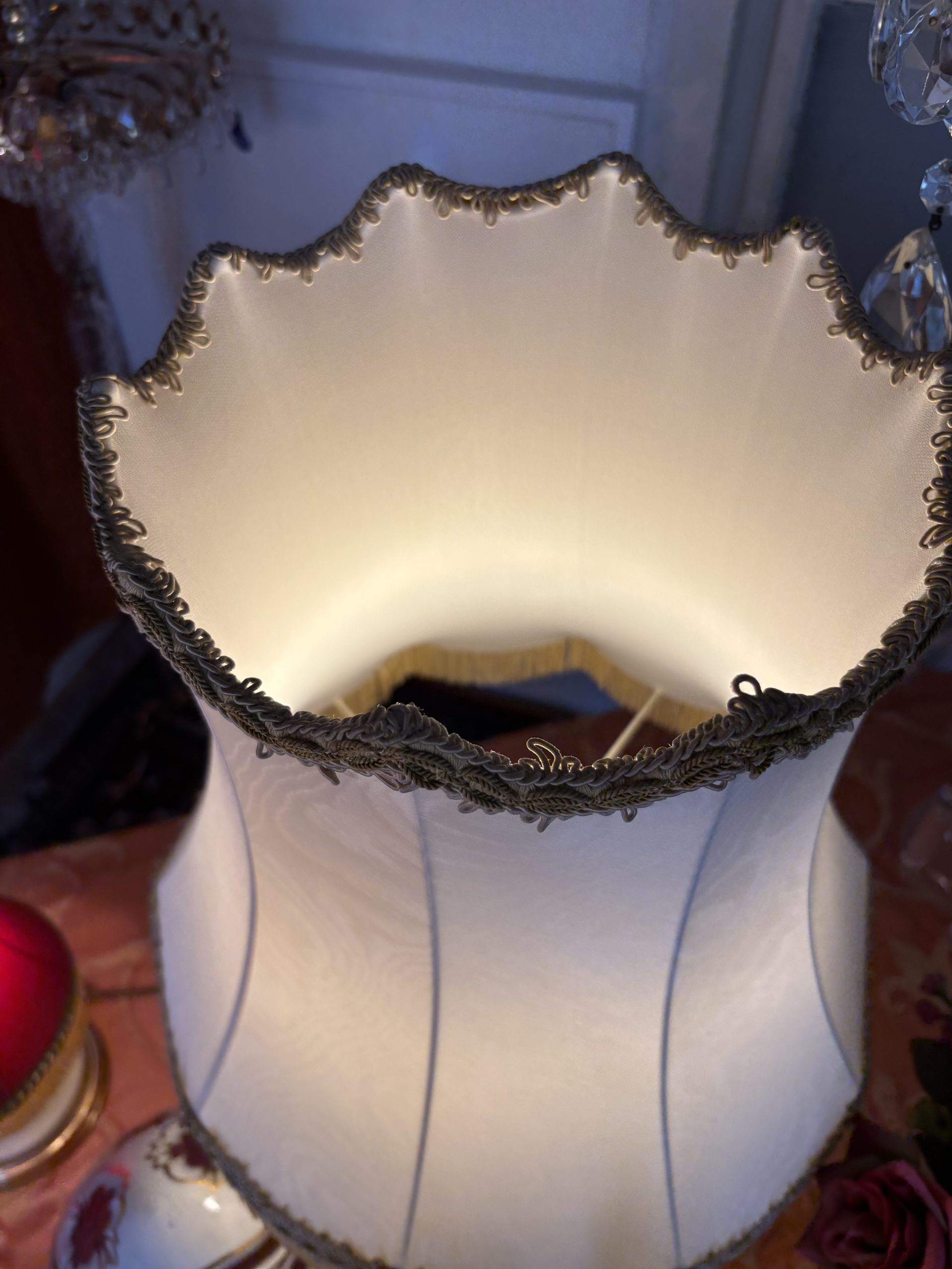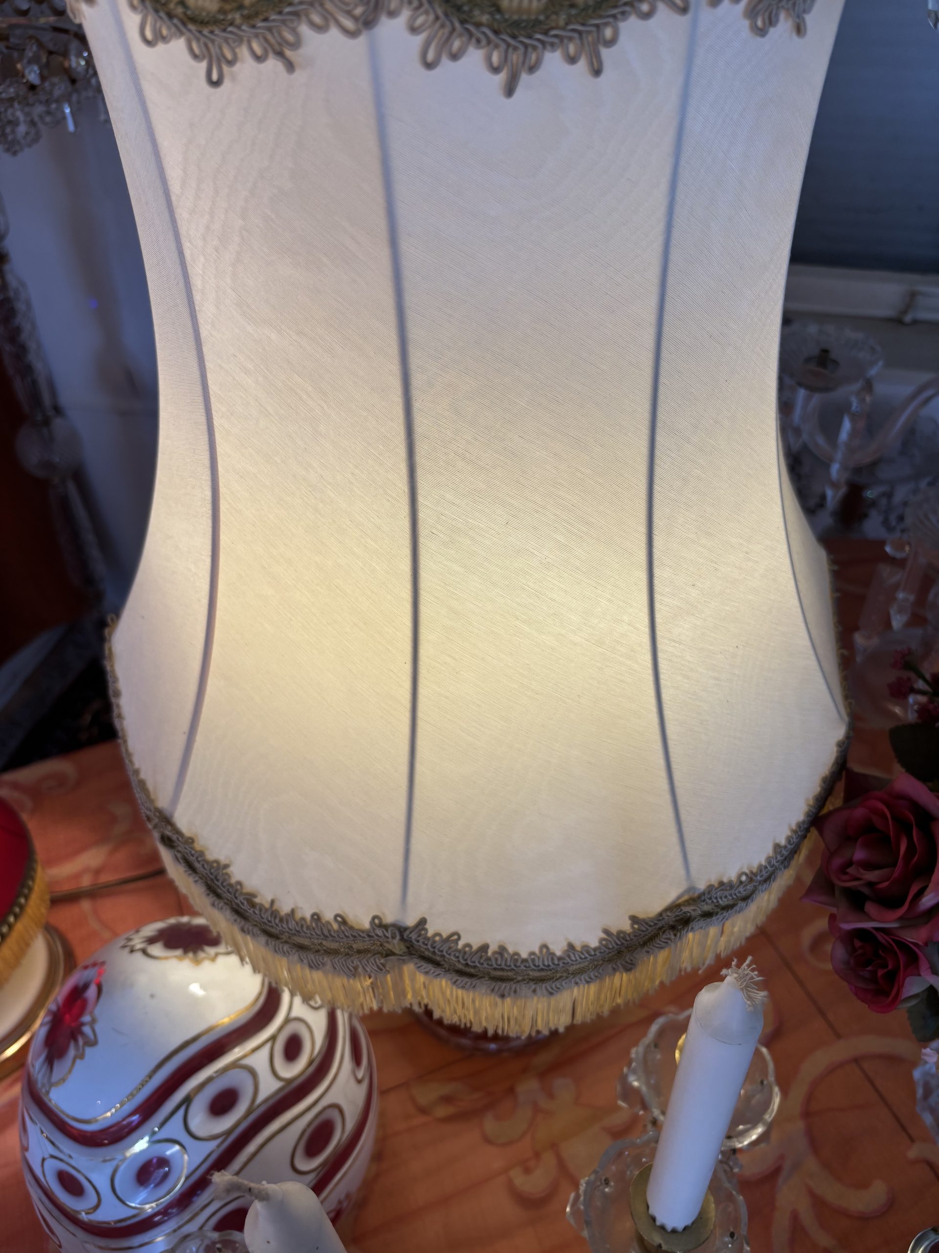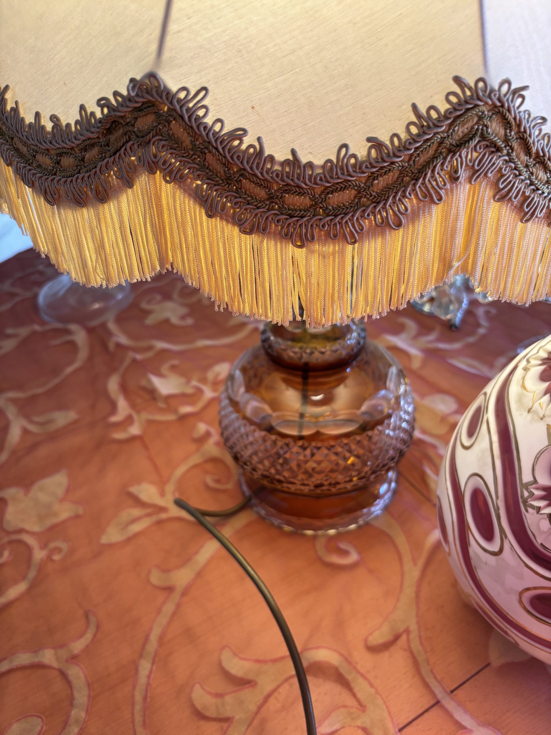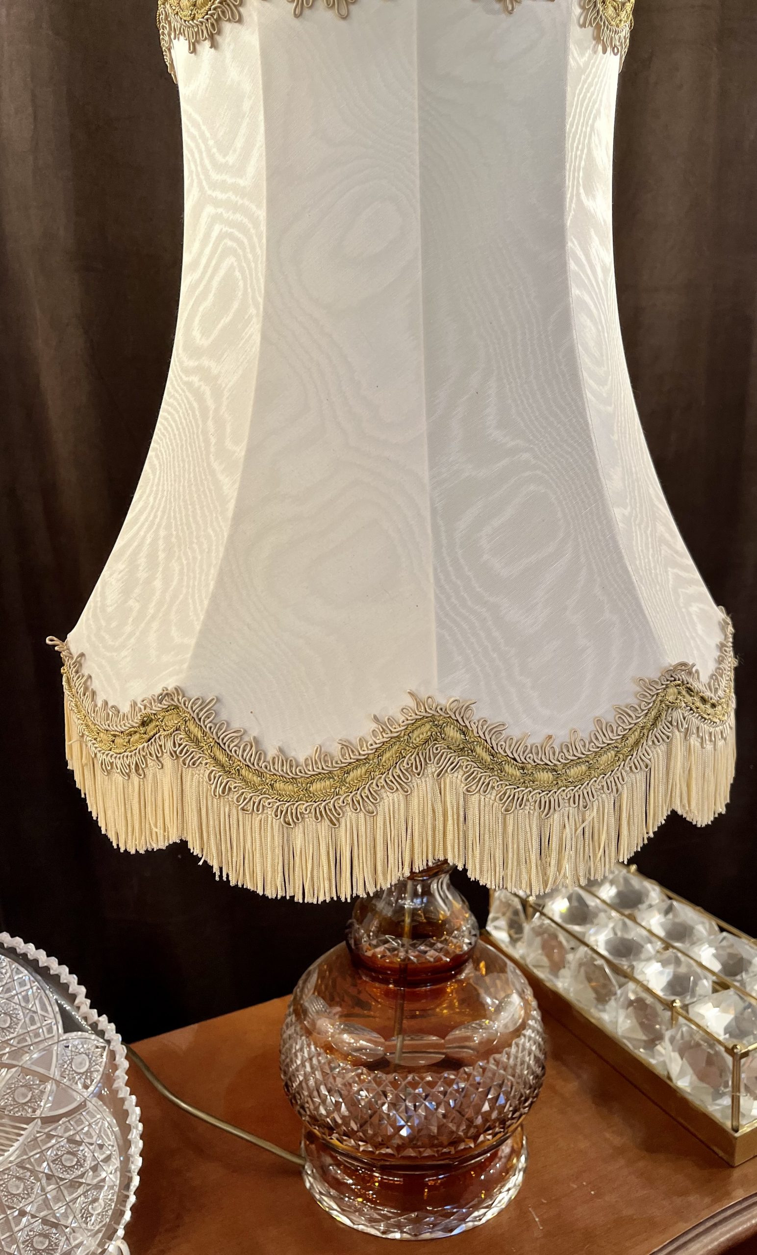 Kristall-Tischlampe mit Fransen-Schirm Ein Hauch von Nostalgie – elegant wie aus einem alten Grandhotel Diese charmante Tischlampe vereint feinstes geschliffenes Kristallglas mit einem opulenten Textilschirm im klassischen Stil. Goldene Borten, zarte Fransen und die edle, leicht schimmernde Stoffstruktur verleihen ihr den Charakter einer vergangenen Epoche – ohne dabei altmodisch zu wirken. Perfekt als Akzentstück in Salons, Schlafräumen oder stilvollen Leseecken.