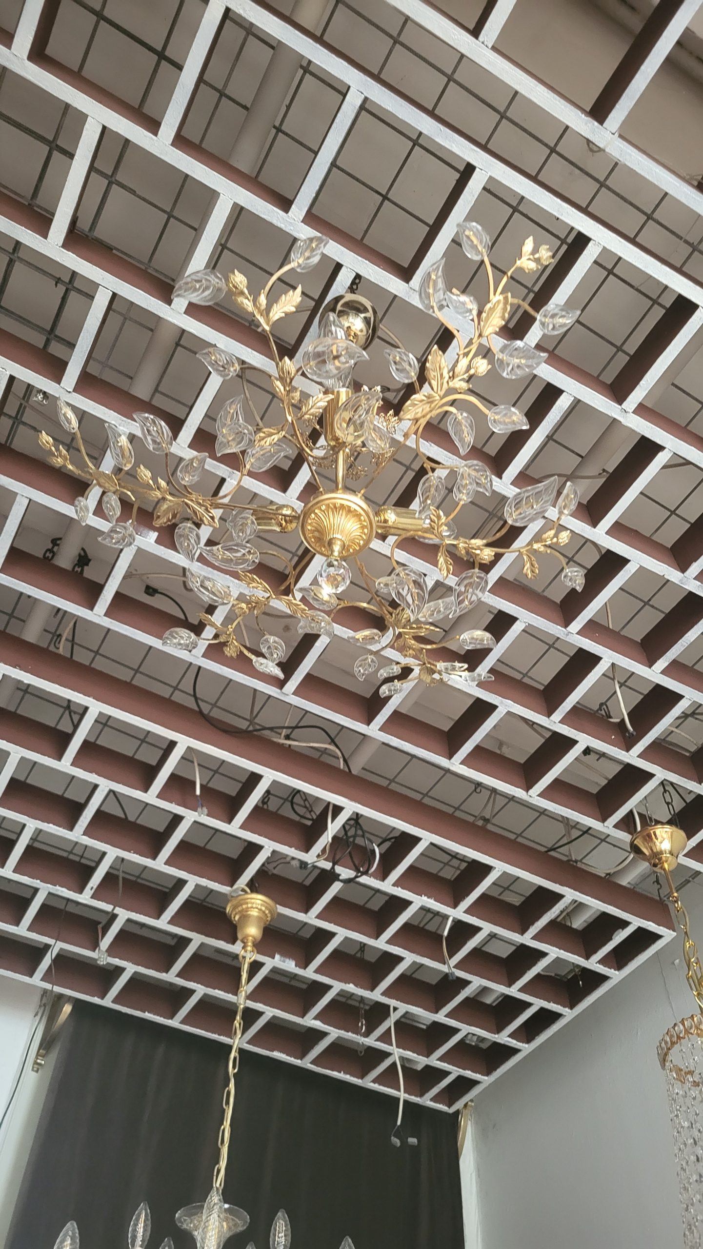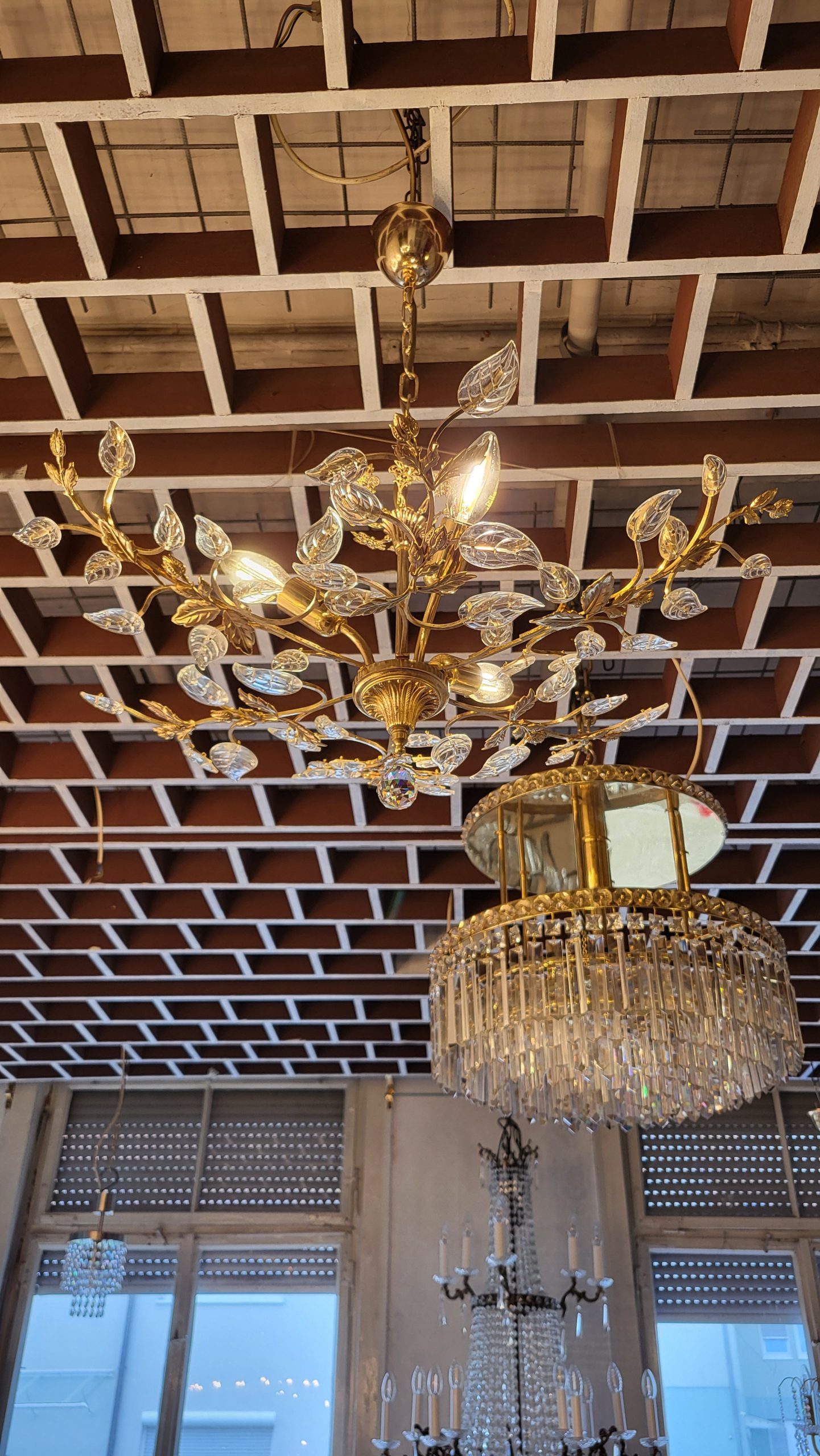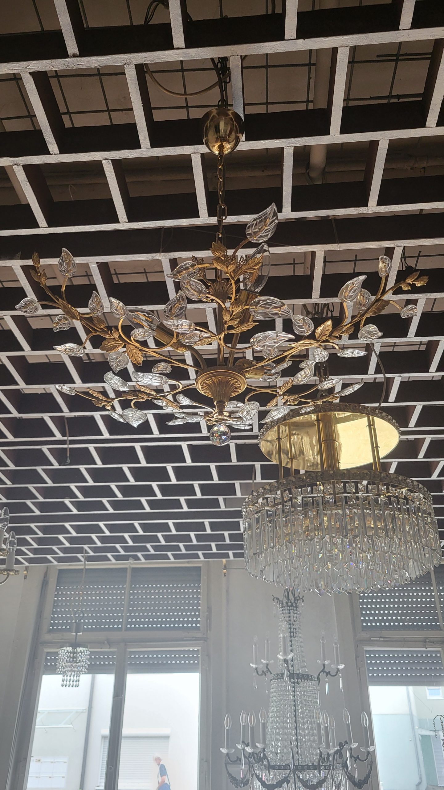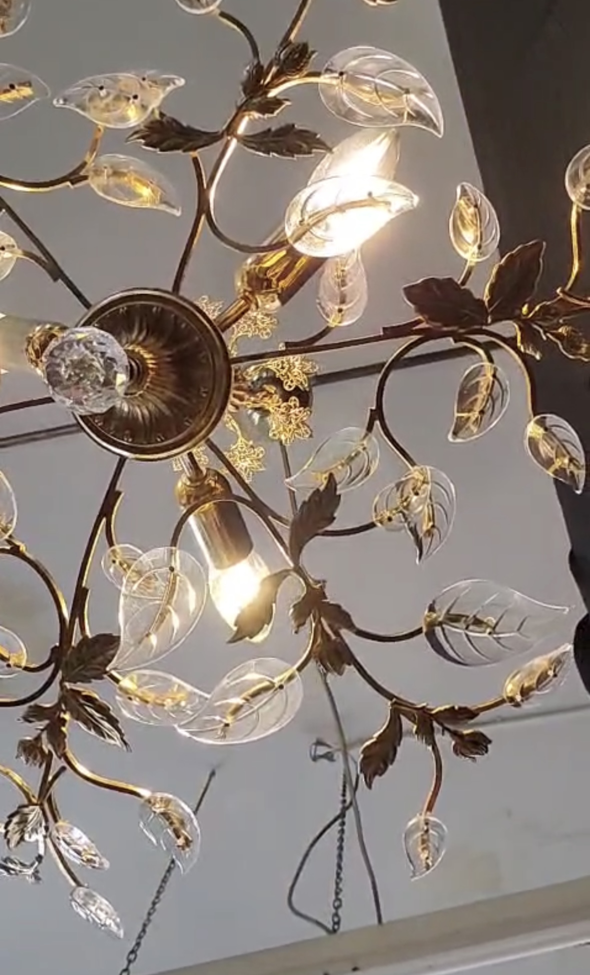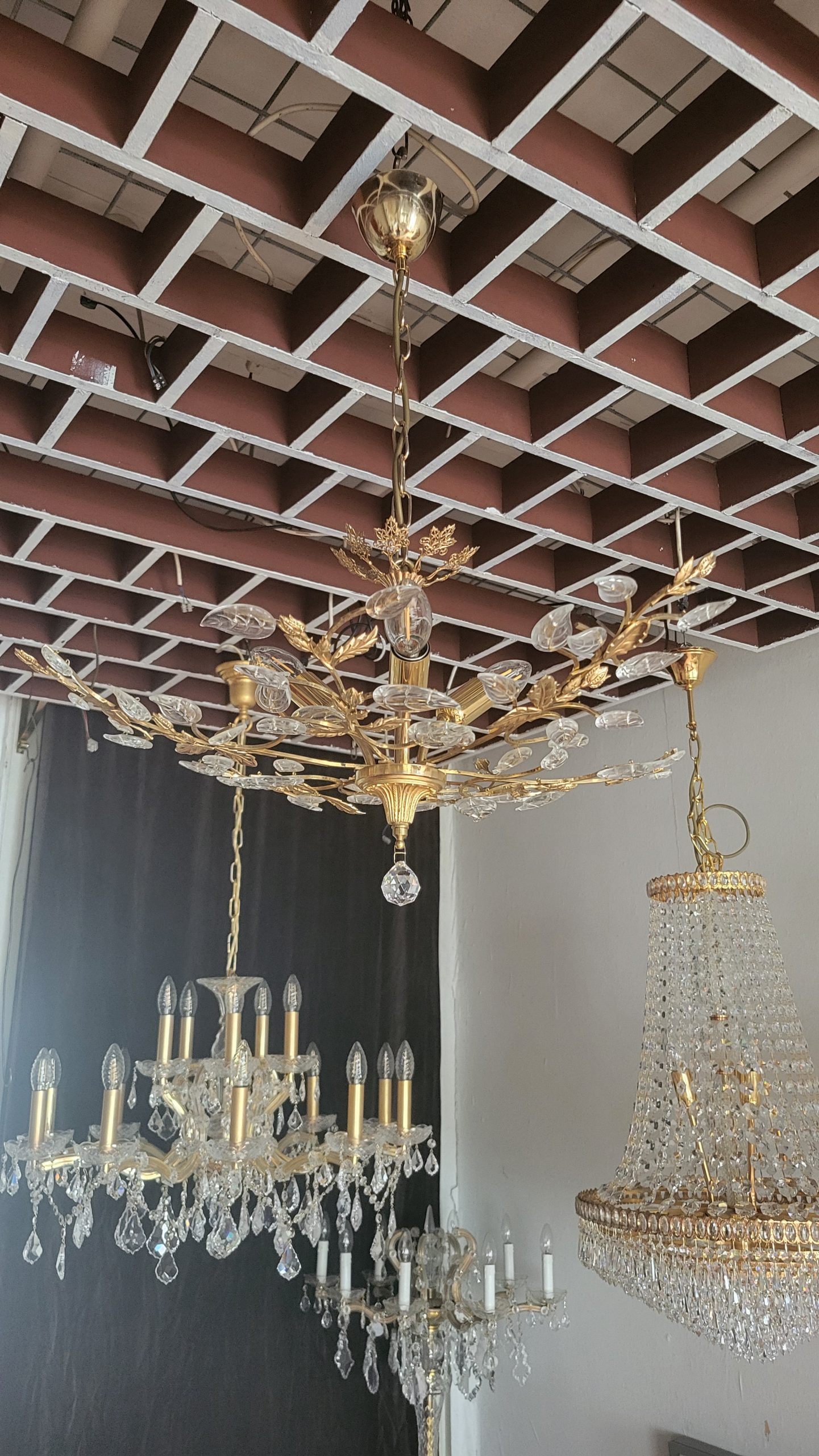 Exklusive Vintage-Kristall-Deckenleuchte – Gold, Floral, Zeitlos Verleihen Sie Ihrem Raum einen Hauch von Luxus mit dieser einzigartigen, floralen Kristall-Deckenleuchte im Vintage-Stil. Das kunstvoll verzierte Design in edlem Goldton wird von filigran geschliffenen Kristallelementen ergänzt, die das Licht auf faszinierende Weise reflektieren. Die elegante Blatt- und Blütenform erinnert an klassische französische oder italienische Stilrichtungen und macht diese Leuchte zu einem echten Blickfang – ideal für Wohnzimmer, Esszimmer, Empfangsbereiche oder stilvolle Boutiquen. Ein Meisterwerk für Liebhaber exklusiver Innenausstattung – kombinierbar mit klassischen oder modernen Elementen für ein stilvolles Ambiente. Details: Hochwertiges Metallgestell in Goldoptik Feine Kristallverzierungen in floralem Design Zustand: Sehr gut,…