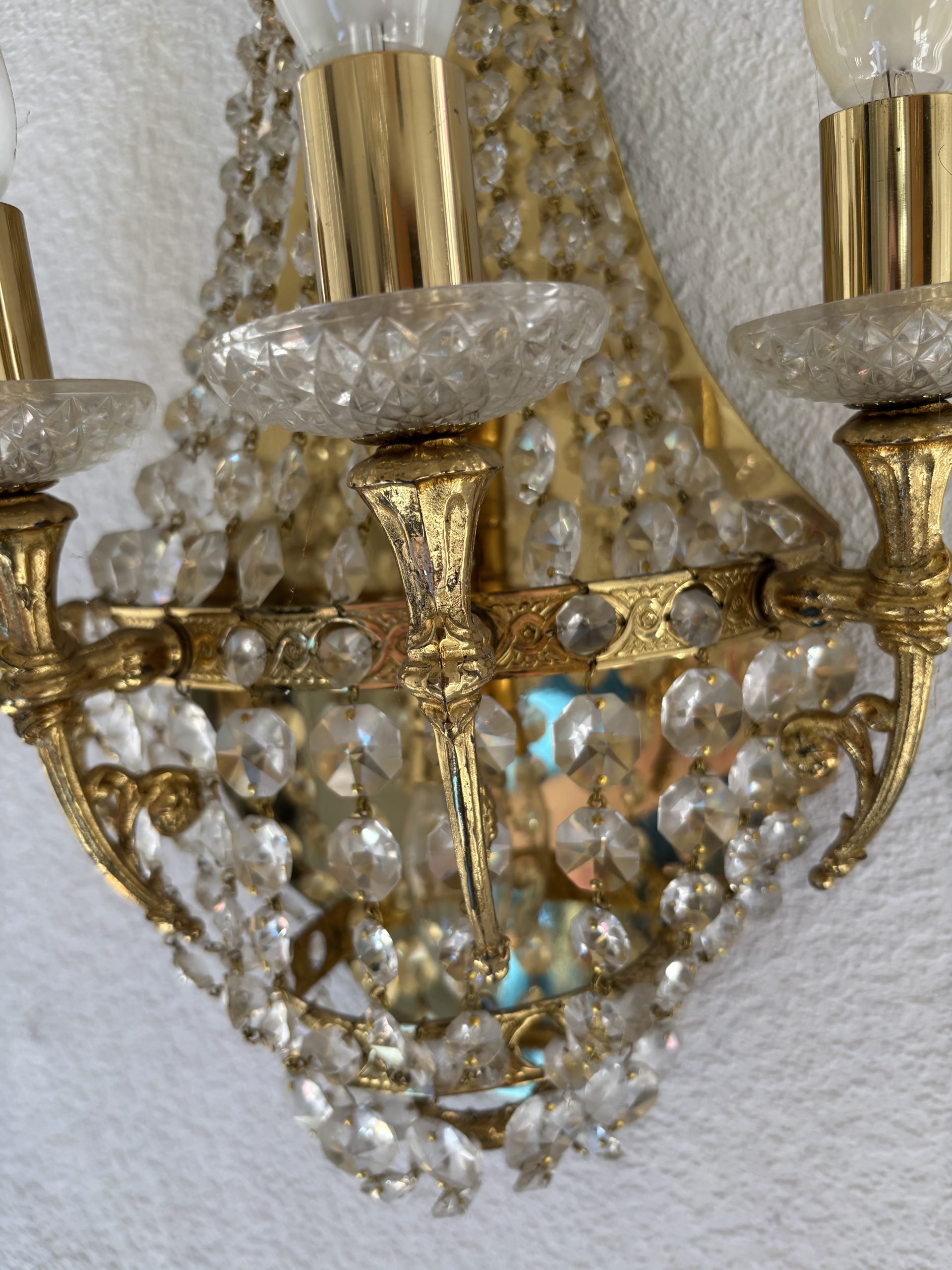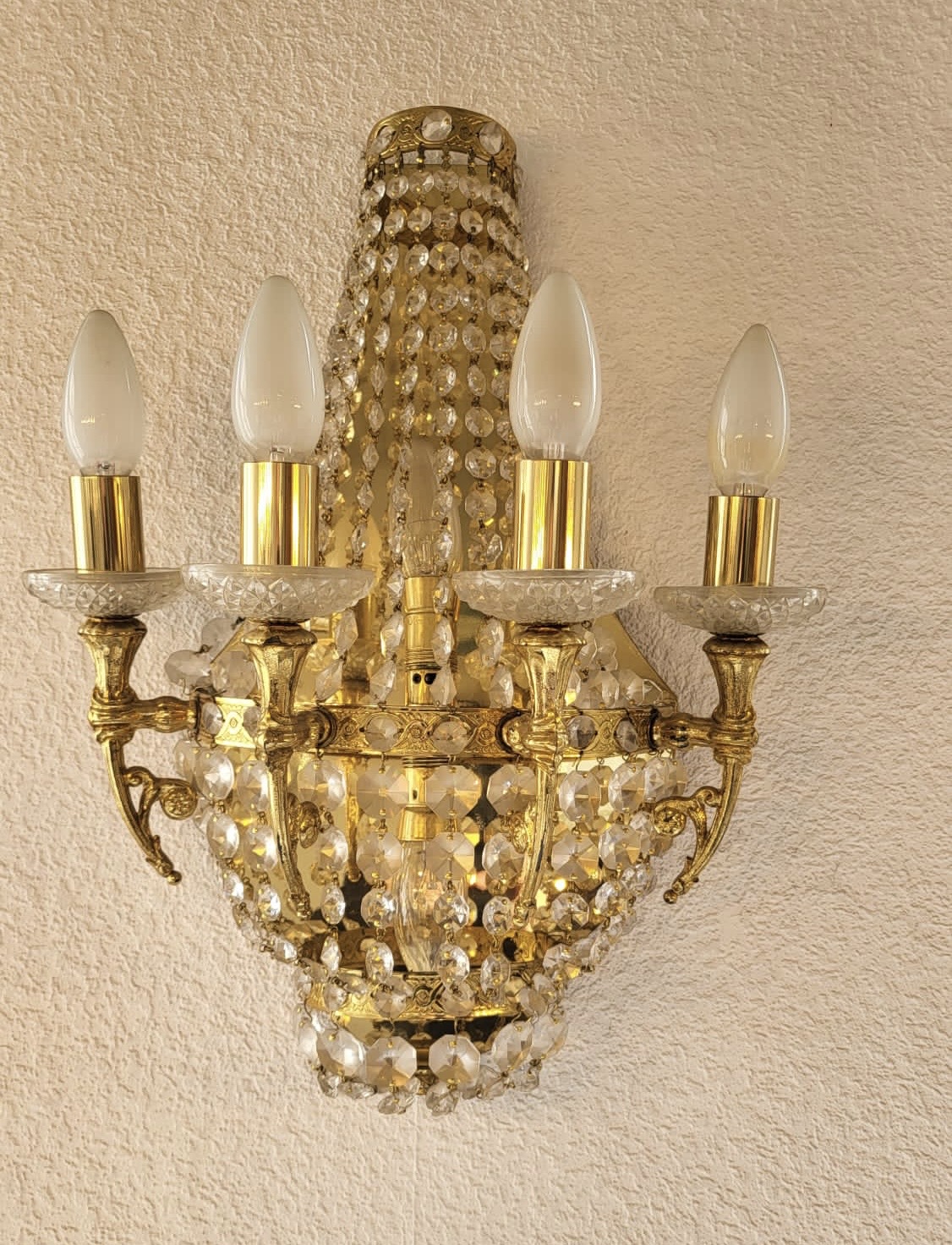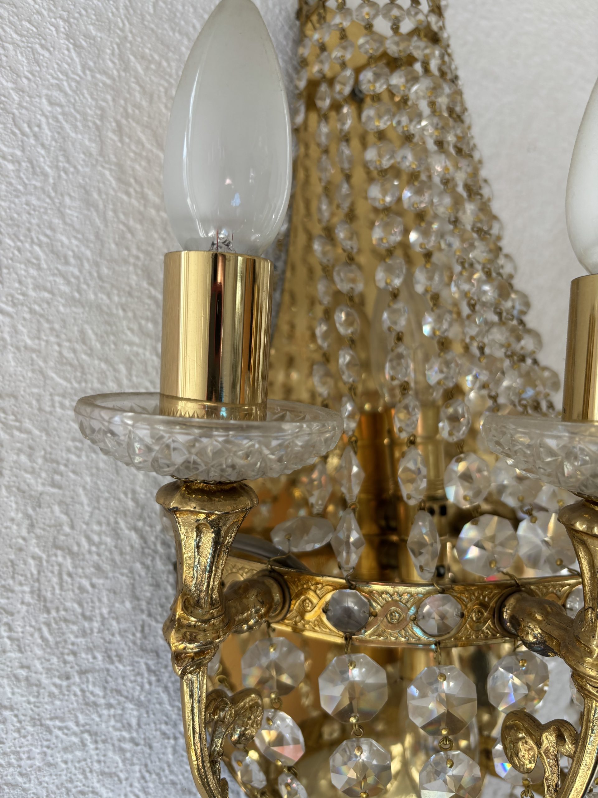 Prunkvolle Kristall-Wandleuchte im Empire-Stil mit 4 Armen Diese Lampe befindet sich in neuwertigem Zustand. Sie war ausschließlich in unserem Ausstellungsraum installiert und diente dort zur Präsentation. Aufgrund der längeren Ausstellungsdauer bieten wir sie nun als Second-Hand-Artikel an – selbstverständlich geprüft, gereinigt und voll funktionstüchtig. Diese elegante Wandlampe vereint die Opulenz barocker Formen mit der Leichtigkeit von Kristallbehängen im Empire-Stil. Die tropfenförmigen Kristalle fangen das Licht ein und reflektieren es in funkelnden Facetten. Der zentrale Korpus ist halbkegelförmig an der Wand montiert und mit aufwendig facettierten Kristallketten und Messingelementen gestaltet.