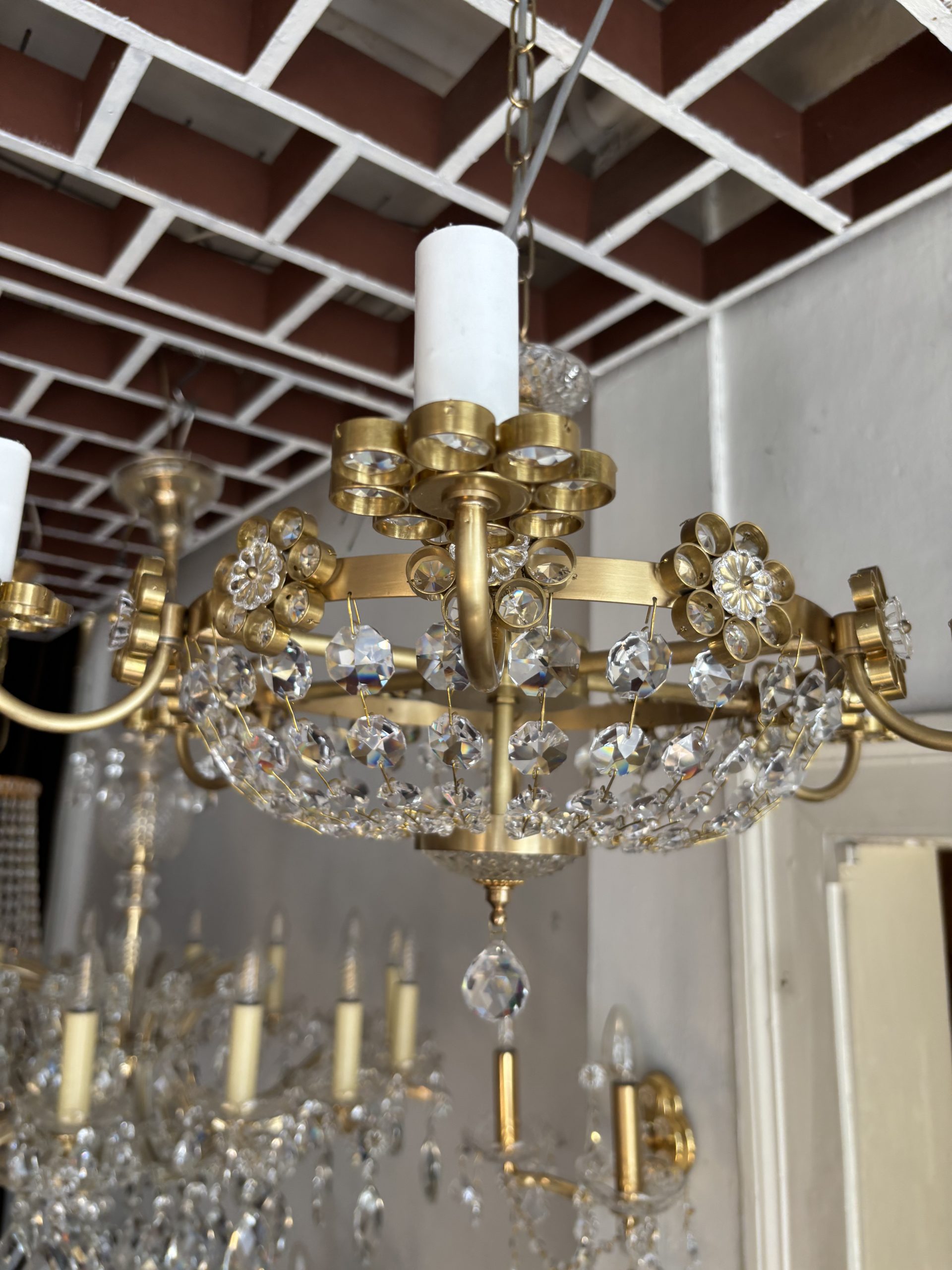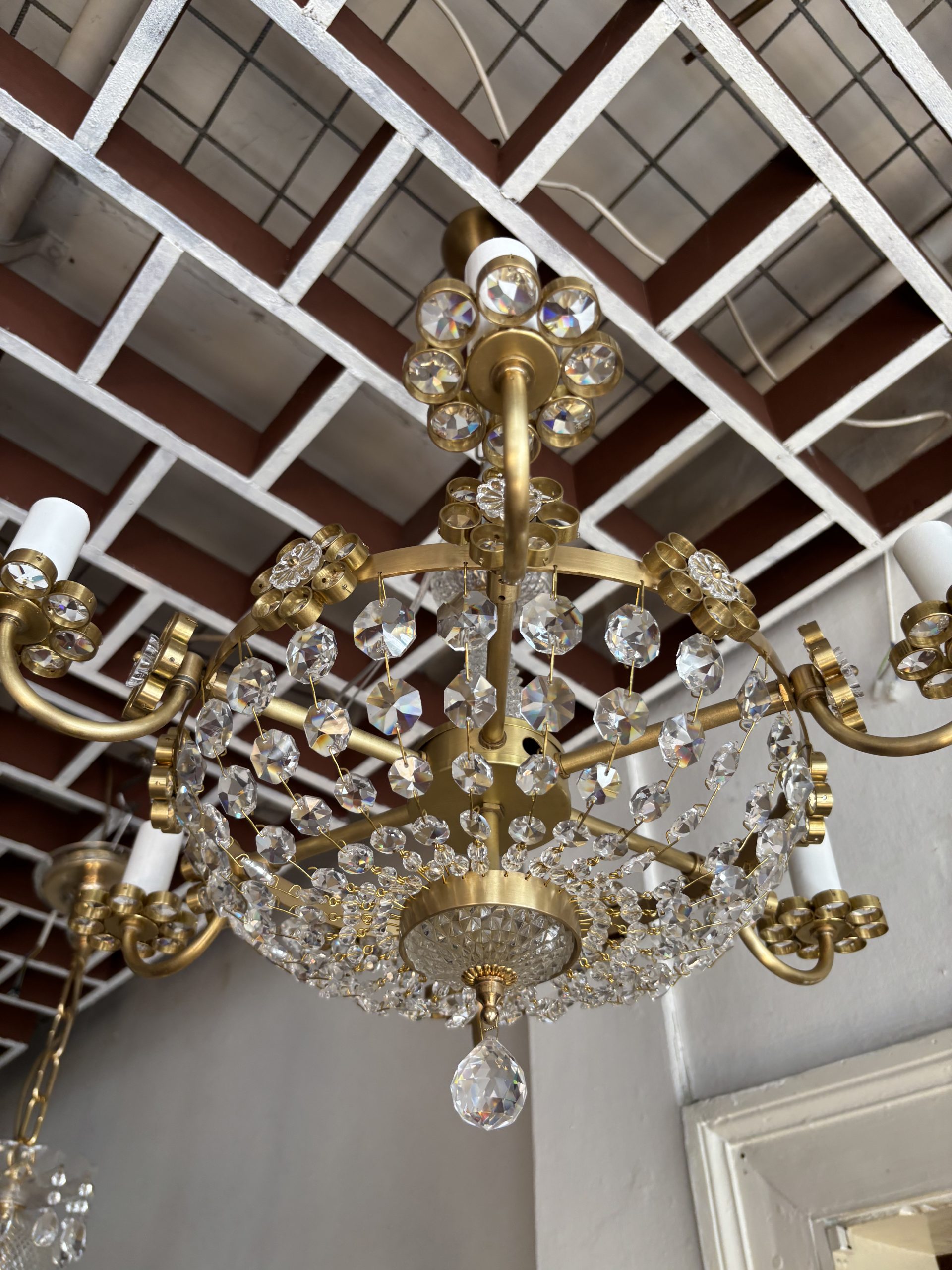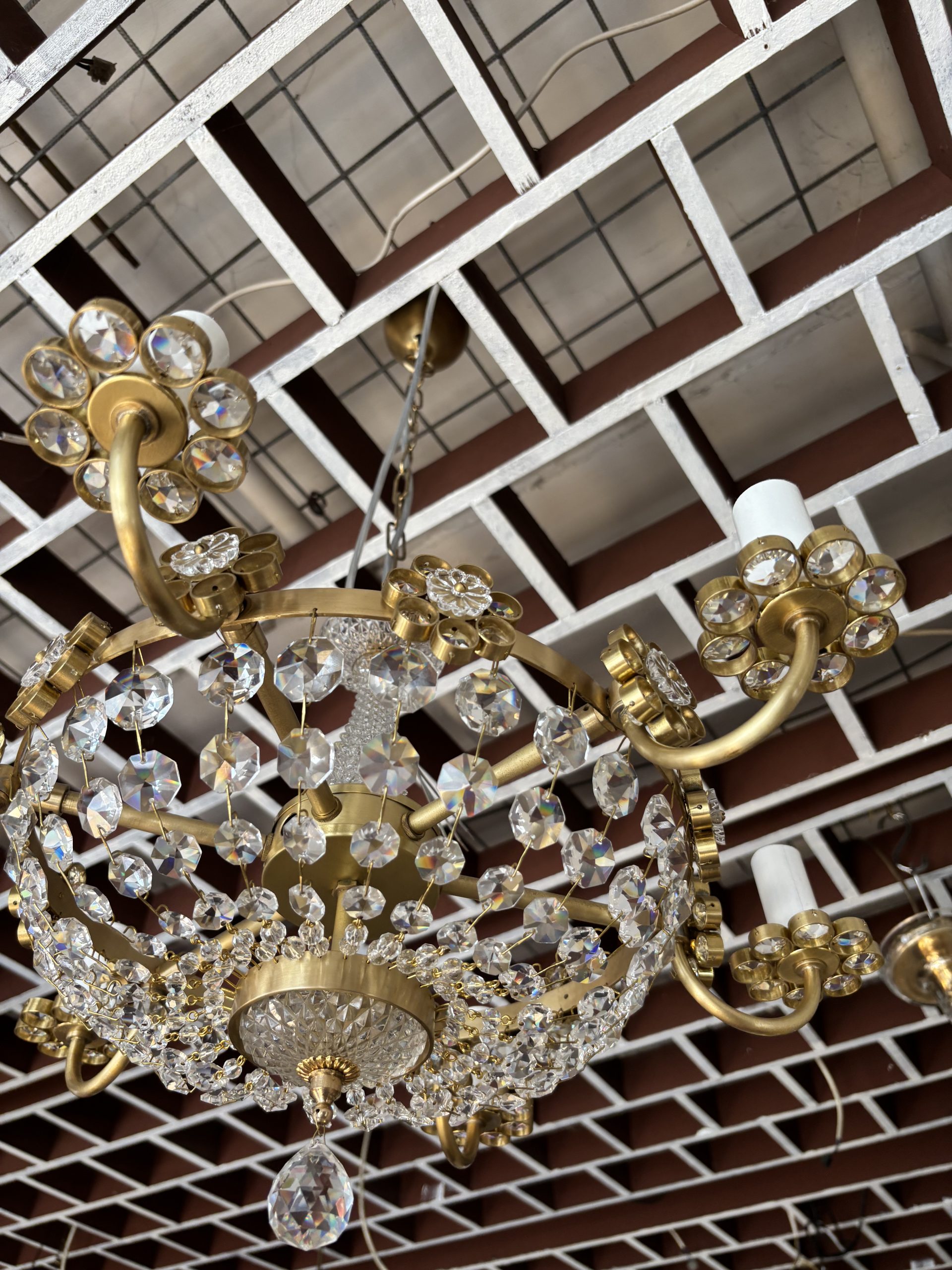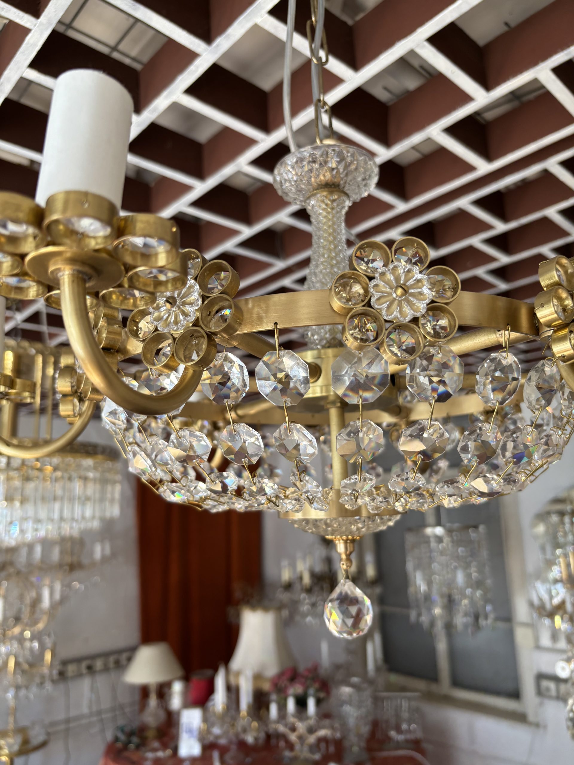 Klassischer Kristalllüster mit goldener Struktur – Eleganz in vollendeter Form Dieser elegante Deckenlüster kombiniert klassische Formensprache mit luxuriöser Ausstrahlung. Die fein aufpolierte Metallstruktur trägt ein kunstvoll gespanntes Netz aus funkelnden Kristallen, das wie ein Lichtteppich über dem Raum schwebt. In der Mitte ziert ein präzise geschliffener Tropfen das Gesamtbild und setzt einen dezenten, aber wirkungsvollen Akzent. Die äußeren geschwungenen Arme nehmen klassische Kerzenfassungen auf und sorgen für eine ausgewogene Lichtverteilung. Ideal geeignet für Wohnräume, Salons, Esszimmer oder stilvolle Eingangsbereiche.