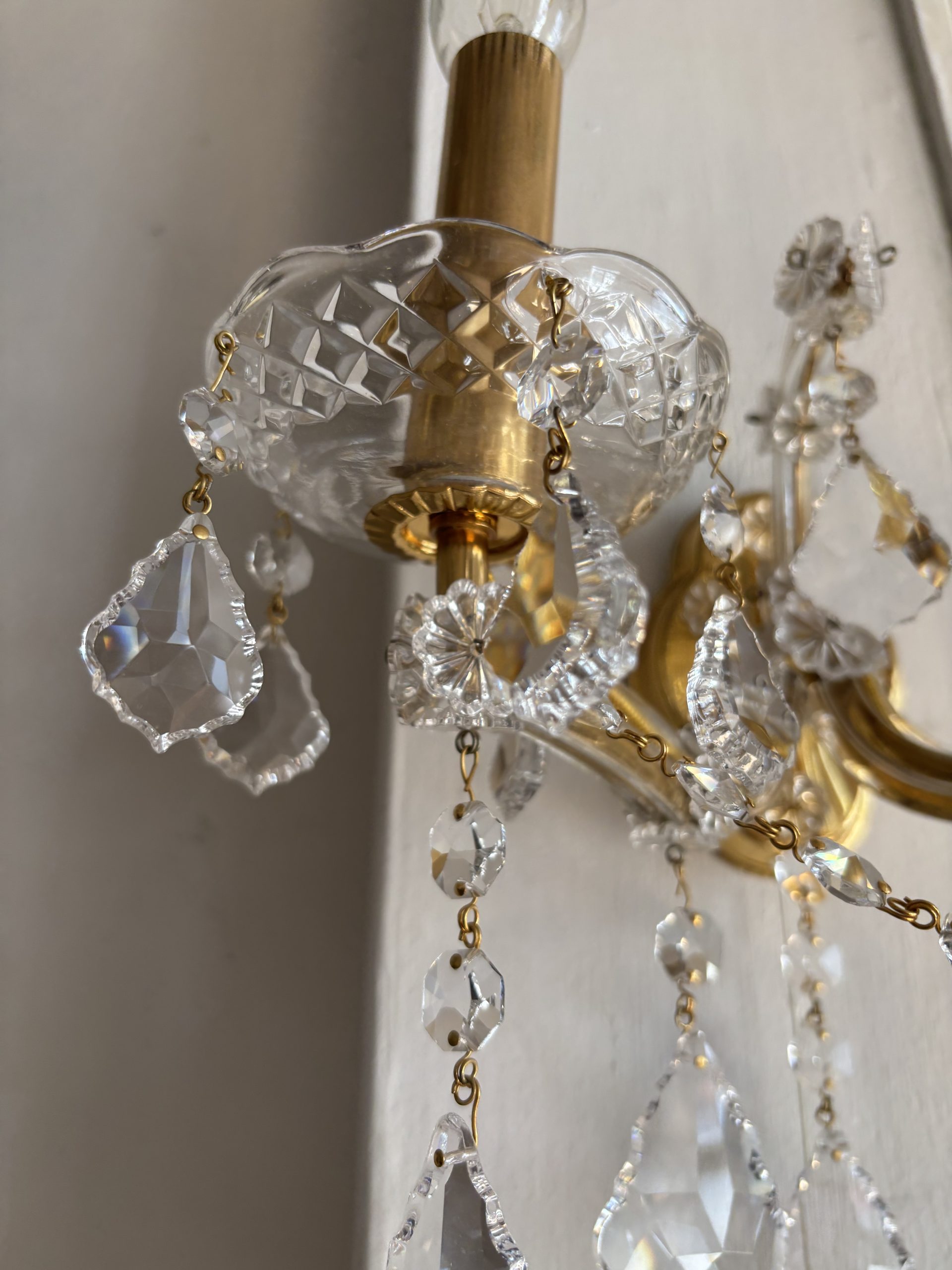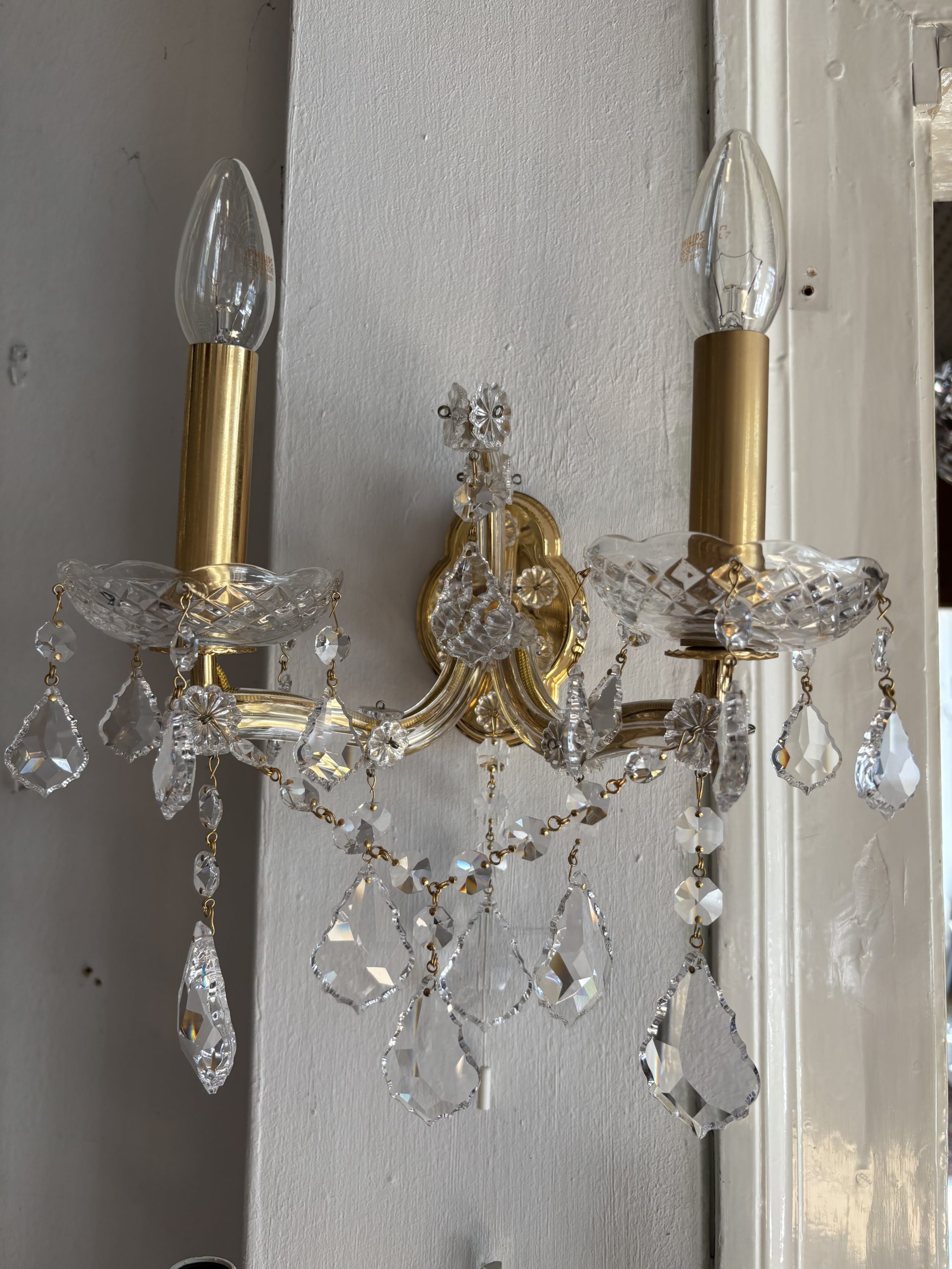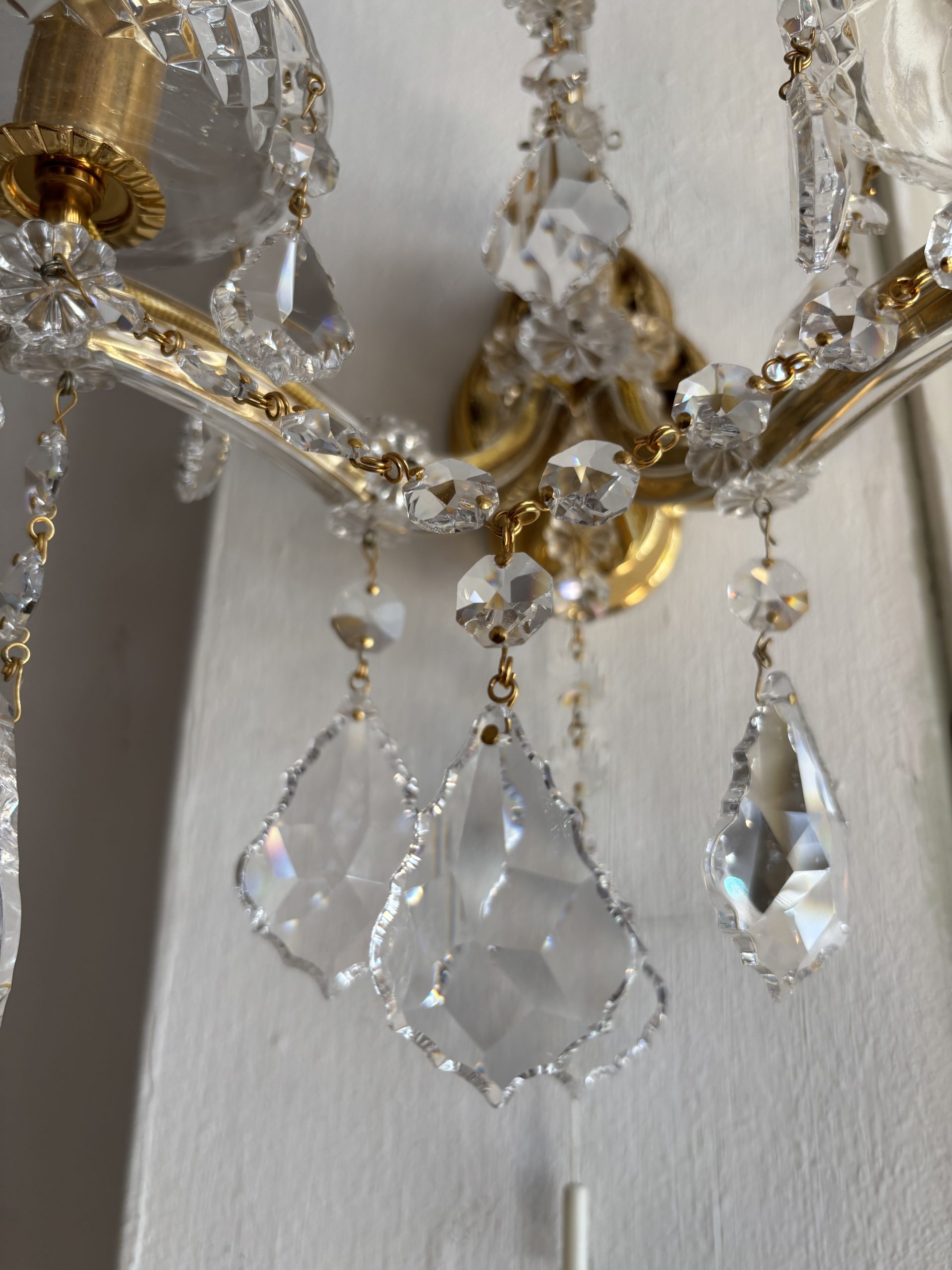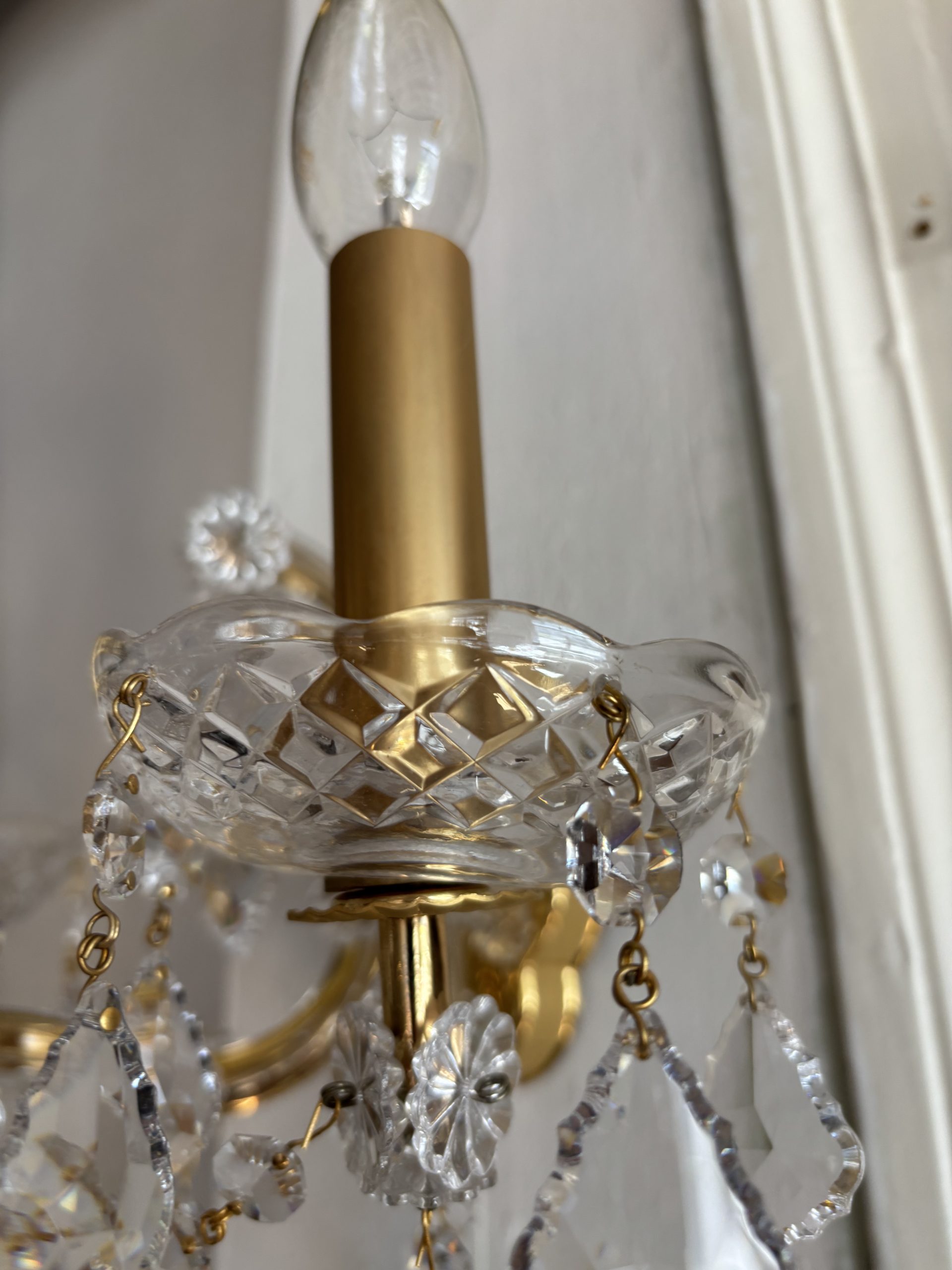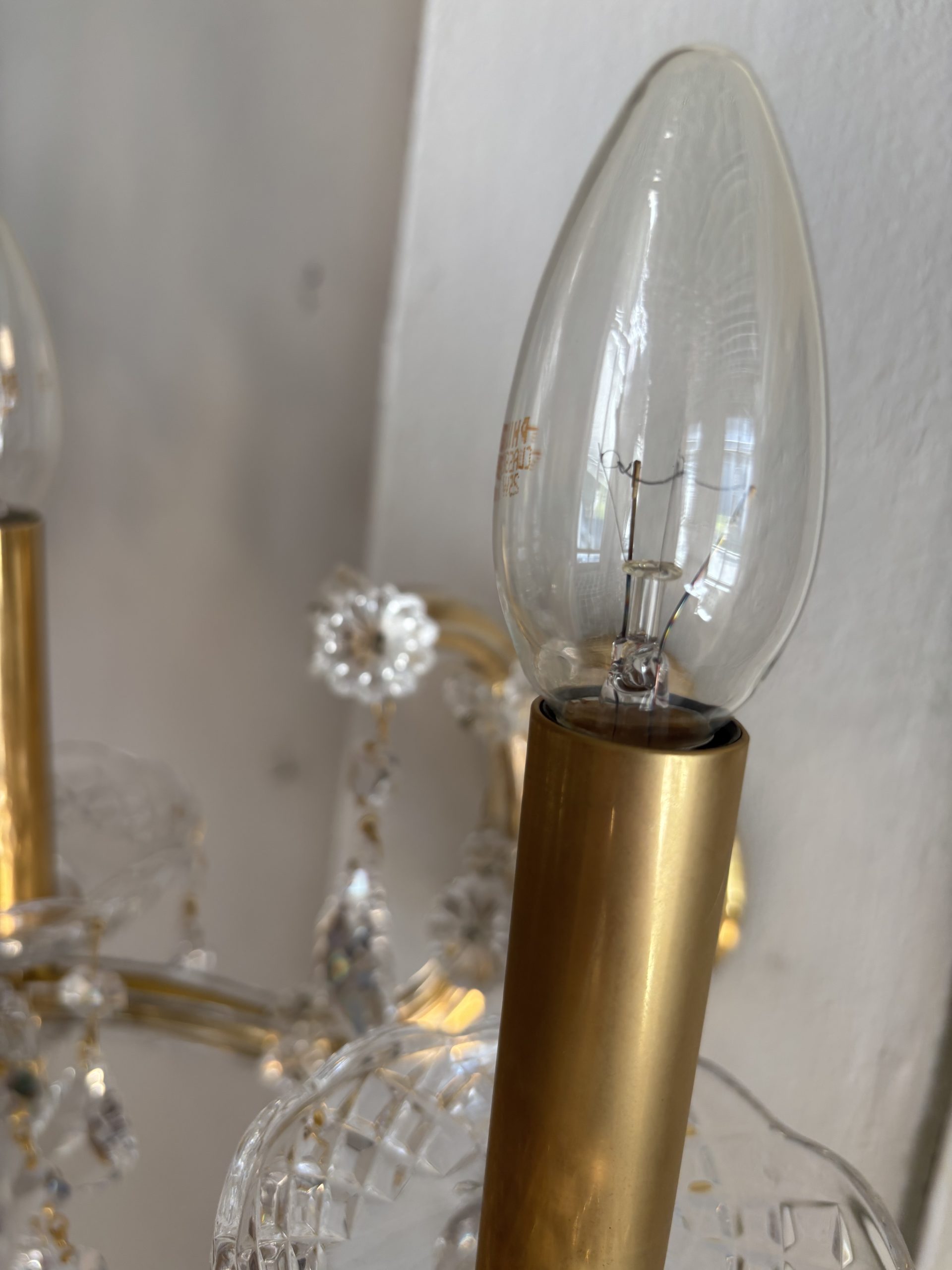 Klassische Kristall-Wandleuchte mit Goldakzenten – Stilvolle Wandbeleuchtung Diese elegante Kristall-Wandleuchte in Zweiflamm-Ausführung vereint klassische Formen mit zeitloser Eleganz. Goldfarbene Metallarme tragen zwei stilisierte „Kerzen“, deren Glaskelche mit fein geschliffenen Kristallprismen umspielt sind. Die aufwendig angeordneten Kristallketten und Tropfen reflektieren das Licht in zahllosen Facetten und verleihen jedem Raum eine warme, funkelnde Atmosphäre. Ideal als Akzentbeleuchtung in Fluren, Salons, Schlafzimmern oder neben Spiegeln – diese Leuchte setzt ein edles Statement an jeder Wand.