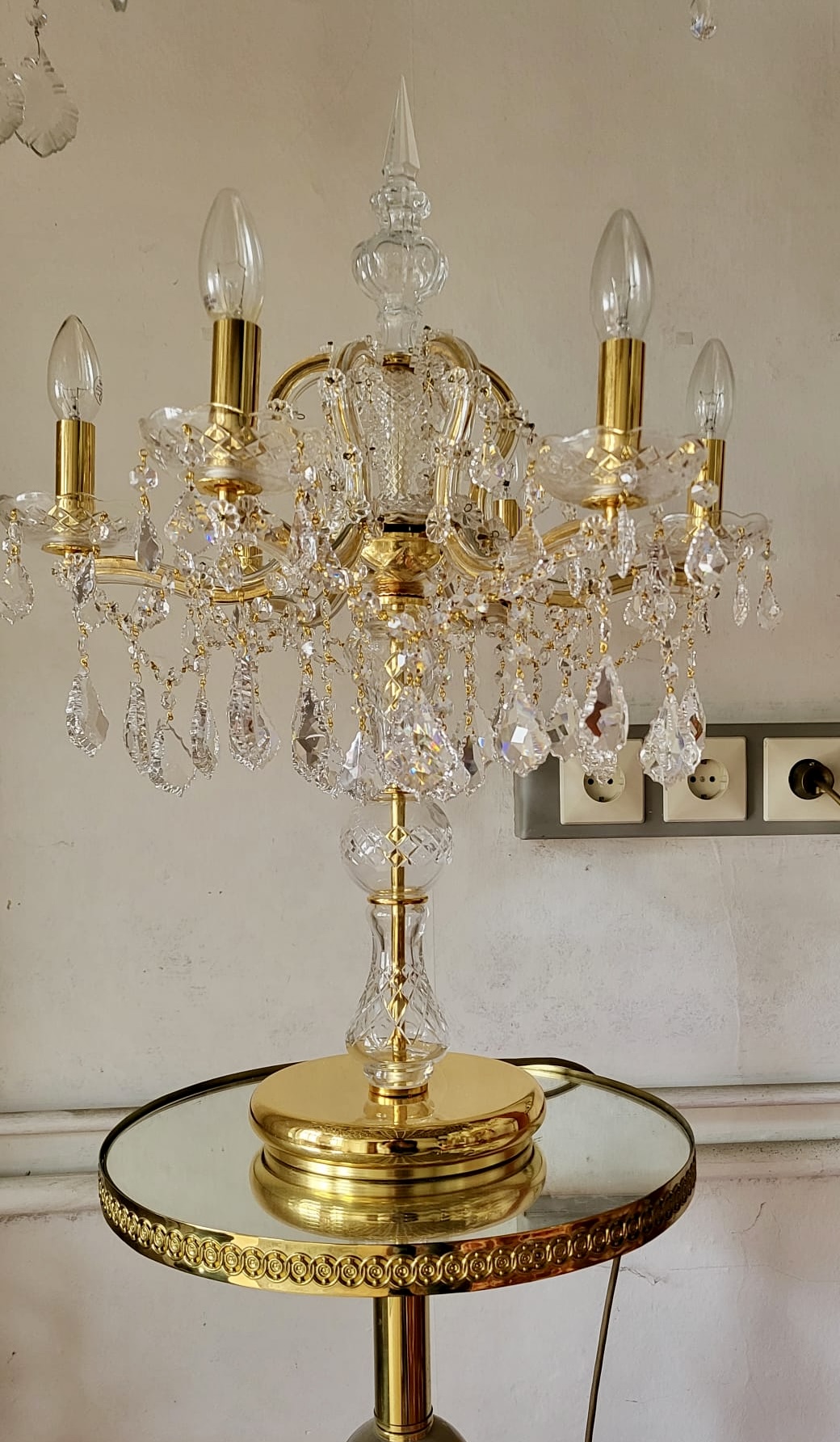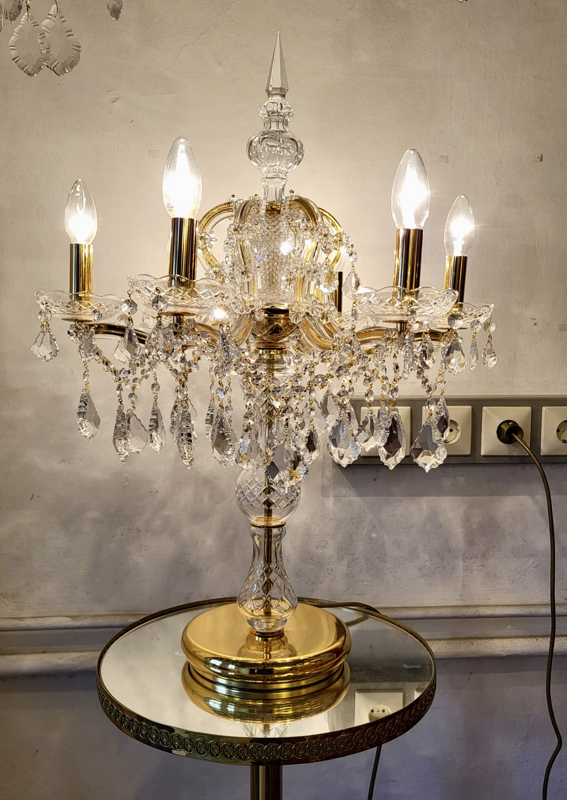 Tischlüster Maria Theresia – Klassik in vollendeter Form Diese elegante Tischleuchte im Stil Maria Theresia bringt barocken Glanz in jeden Raum. Der geschwungene Leuchtenkörper in Kombination mit fein geschliffenen Kristallen sorgt für eine stilvolle Lichtatmosphäre. Ob auf einer Kommode oder auf einem Beistelltisch – dieses Schmuckstück vereint Tradition und Luxus auf kleinem Raum.