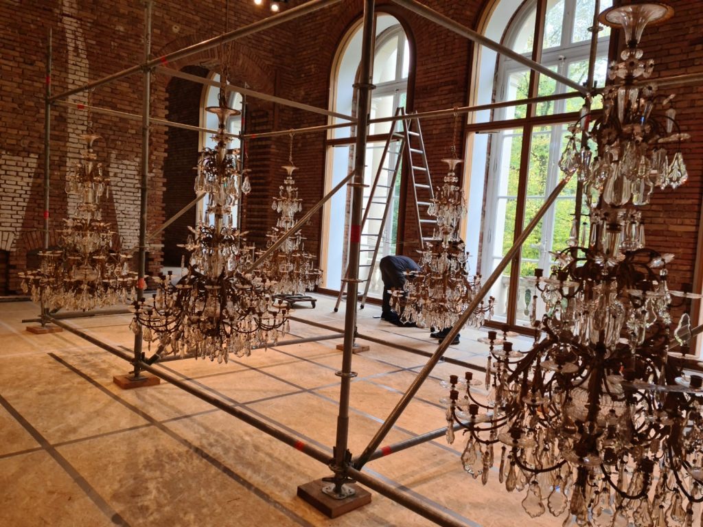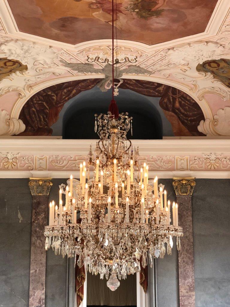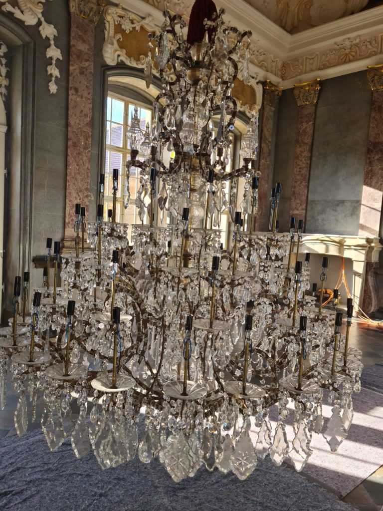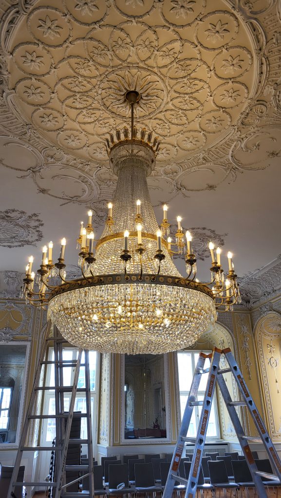 Die Kronleuchter in den Sälen und Prunkräumen sind zentrale Elemente dieser Wirkung. Unsere Aufgabe war es, diese wertvollen Leuchter im Rahmen einer fachgerechten Reinigung zu erhalten.