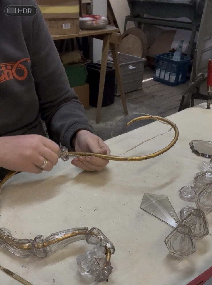 Mit fachlicher Expertise und größter Sorgfalt durften wir mehrere dieser Leuchter reinigen und restaurieren. Ziel war es, die originalen Materialien, die Patina und die Funktion der Leuchter zu bewahren – ohne ihre historische Substanz zu beeinträchtigen.