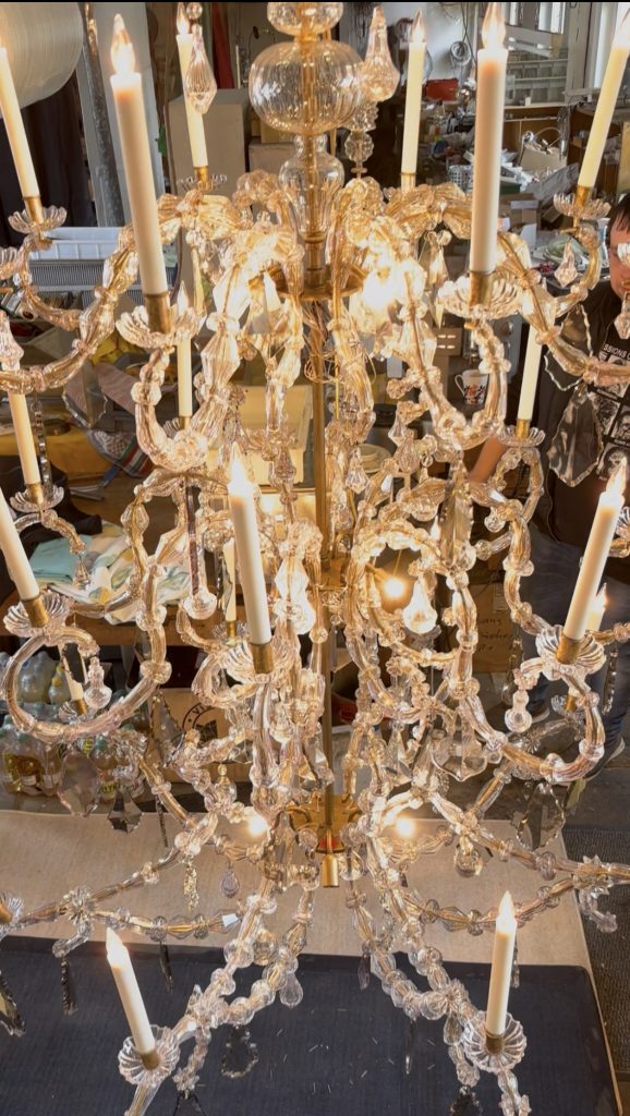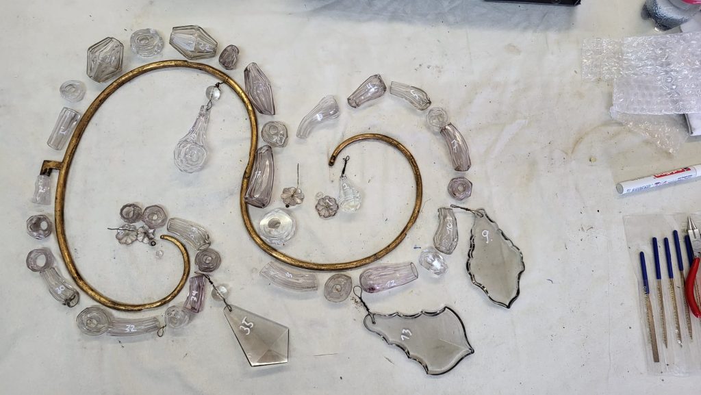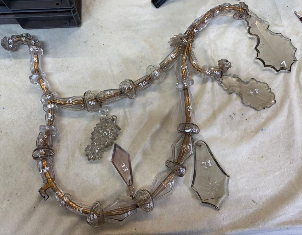 Im Rahmen unserer Arbeiten wurden ausgewählte Leuchter vollständig in ihre Einzelteile zerlegt, behutsam gereinigt und restauratorisch behandelt. Dabei kamen spezielle Verfahren zur Anwendung, die empfindliche Materialien wie Vergoldungen, Glas und Kristall schonend, aber effektiv pflegen.